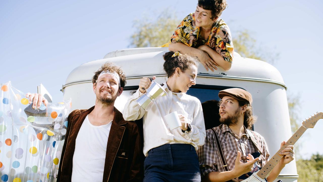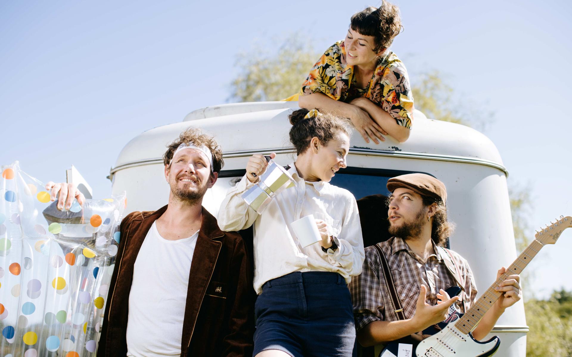 Drei Artist*innen, ein Musiker und ihr Wohnwagen.